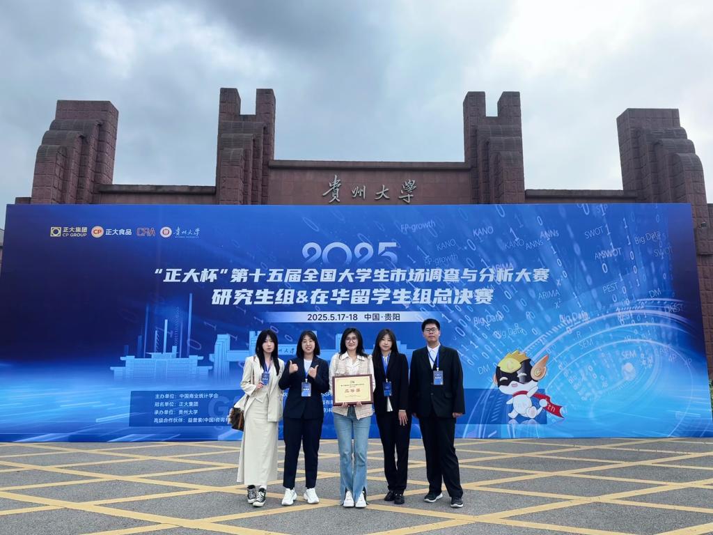 近日,第十五届全国大学生市场调查与分析大赛研究生组及在华留学生组总决赛于贵州圆满收官。作为国内市场营销与统计学领域的顶级赛事,本次大赛吸引了全国1184所高校、超34万名学子踊跃参与,其中研究生与留学生赛道汇聚589所高校同台竞技。在这场高规格赛事中,我校beat365英国官网网站参赛团队凭借深厚的专业功底与卓越的协作能力,一举揽获国家级二等奖1项、省级一等奖1项、二等奖2项、三等奖4项,展现出强劲的学科实力。