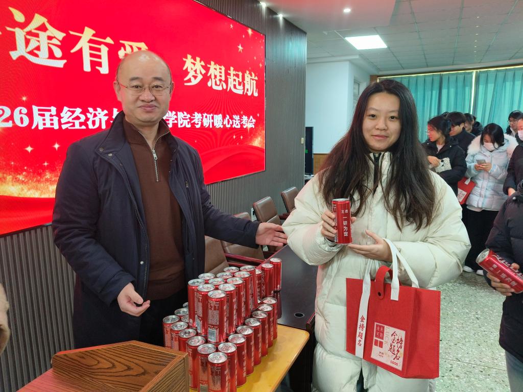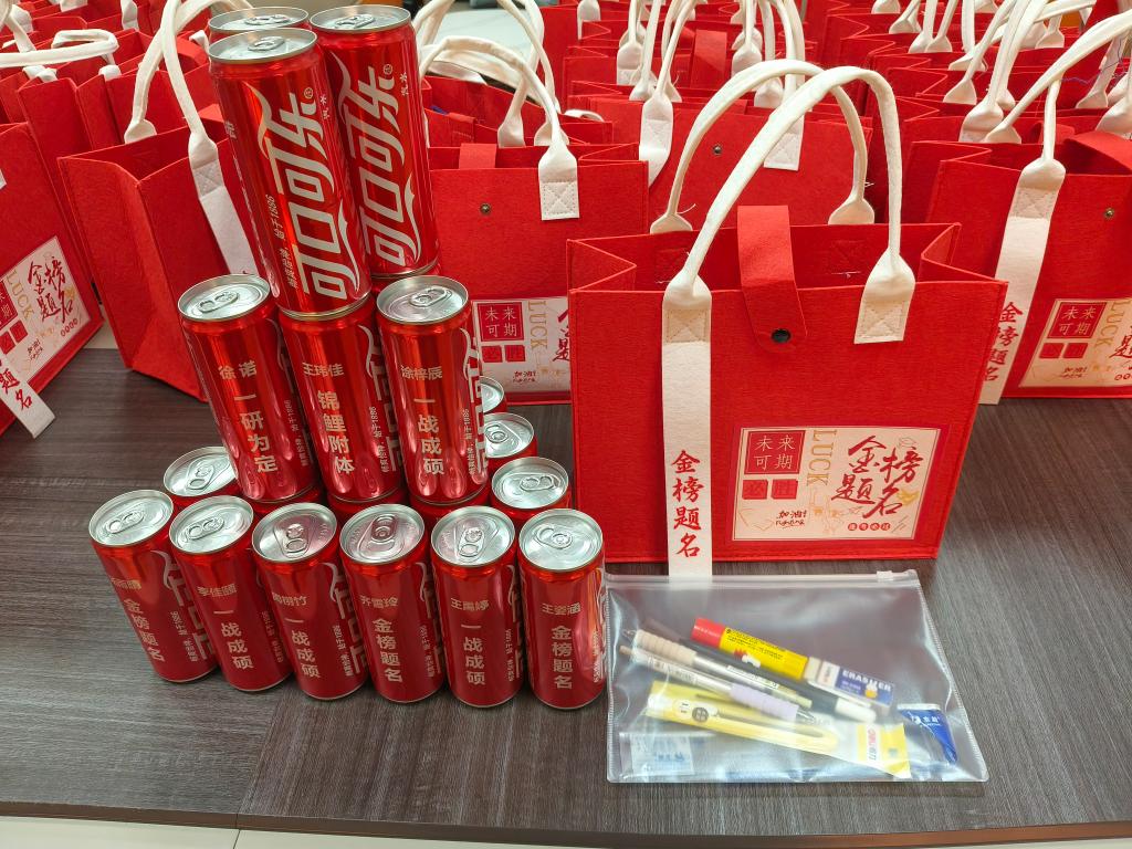 一份精心筹备的“金榜题名大礼包”,更是将学院的关怀落到实处。礼包里,印着每位考研学子姓名和“一战成硕”“金榜题名”等暖心祝福语的定制可口可乐和实用的文具包承载着专属的美好期许,从备考细节到考场需求全方位为学子保驾护航。当学子们双手接过这份沉甸甸的礼包时,脸上满是感动与振奋,现场掌声阵阵,暖意涌动。