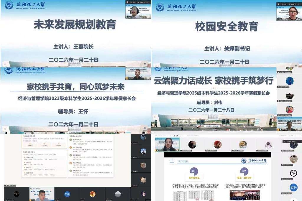 1月20日至29日,学院1500余户家庭齐聚云端参与线上家长会,尽显学院学生工作的温度与实效。学院紧扣2022-2025级不同年级学生的成长特点与发展需求,分层分类召开全年级线上家长会,精准对接各学段育人重点。学院院长王蓉、党委副书记关婷出席会议并讲话。王蓉立足就业新形势,解析考研、考公及就业现状趋势,引导学生认清时事、科学规划发展方向;强调考研备考需掌握高效方法、保持平稳心态,全力冲刺上岸目标。关婷率先围绕校园安全、交通安全、反诈防诈等开展专题教育,结合案例强化防范意识,筑牢安全防线。随后,各年级辅导员简要复盘年度工作,从思想引领、学风班风建设、心理健康教育、竞赛成果展示等维度,呈现学生斩获多项竞赛奖项的亮眼成绩,彰显学风建设成效。针对不同年级的核心任务,会议精准锚定各学段育人重点:聚焦2022级学生,重点开展春招、双选会筹备指导与考研考公专项辅导;聚焦2023级学生,着重推进学业规划与职业发展路径指引;聚焦2024级学生,全力抓实学风建设与四六级通关帮扶;聚焦2025级学生,扎实做好学业适应与生涯启蒙教育,为学生和家长提供靶向性指导。