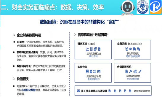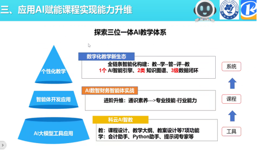 主讲嘉宾林剑平副院长围绕四大核心模块展开深度分享:在政策解读环节,系统梳理了“十五五”规划建议、教育强国建设规划纲要等国家层面关于人工智能产业发展与教育数字化的战略部署,解析了会计行业人才发展规划对复合型财会人才的需求导向;在行业痛点分析部分,精准剖析了传统财会实务中存在的“数据孤岛”“决策依赖经验”“流程僵化低效”三大结构性障碍,结合非结构化数据利用不足、复杂场景认知过载等实际问题,阐明了数智化转型的紧迫性;在实践应用分享中,通过财务智能体开发案例、RAG检索增强生成技术应用、多智能体协同工作模式等实操案例,生动展示了人工智能在财务审计、数据分析、风险管控等场景的落地成果;在课程体系构建环节,基于“以赛促改、以赛促建、以赛促教、以赛促学”的理念,提出了“通识素养-专业技能-行业能力”三阶递进的课程建设思路,分享了科云在AI数智财务智能体实战教学中的成熟经验。