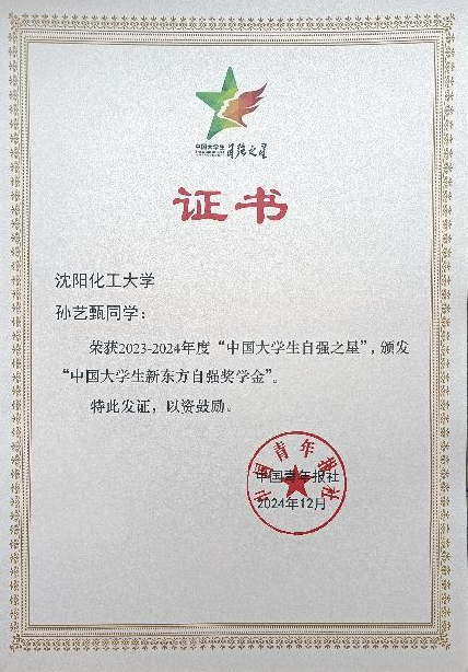 近日,从共青团中央、全国学联传来喜讯,由团中央基层建设部、中国青年报社、新东方教育科技集团、中国青年创业就业基金会联合举办的2023 - 2024年度“中国大学生自强之星”奖学金评选结果揭晓,beat365英国官网网站孙艺甄同学凭借出色的个人表现和突出的自强事迹,荣获“中国大学生自强之星”荣誉称号。